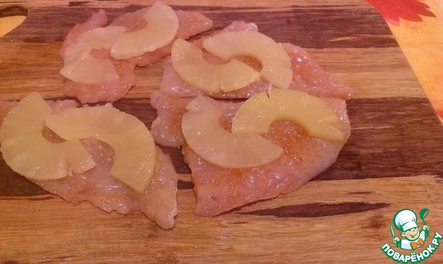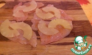 • Беремся за курицу. Куриное филе разрезаем вдоль на несколько пластов - 3 или 4 пласта с одной половинки. Слегка отбиваем, солим, перчим, выкладываем или на противень, или в формочку (предварительно смазываем оливковым или подсолнечным маслом) и сверху выкладываем половинки ананасов, которые к тому же еще и вдоль разрезаны, чтобы слой ананаса был тоньше - так будет вкуснее.