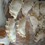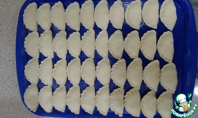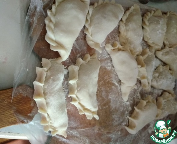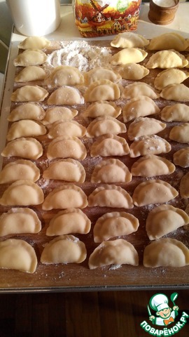 Теперь внимание, та маленькая горка муки, которая лежит на краю стола, нам очень нужна сейчас. Ту руку, которой вы залепливаете вареник, надо хорошо обмакнуть в муку. Тесто обладает пластилиновым эффектом, края слепливаются идеально, но при сдавливании наружная часть шва может потянуться за пальцами. Чтобы этого избежать, каждый раз обмакиваем пальцы в муку. Так лепим все вареники или пельмени. Те, что предназначены для заморозки на НЗ, я сразу партиями выкладываю на слегка посыпанную мукой разделочную доску (у меня есть одна, точно влезающая в морозильник), слегка подмораживаю и укладываю в тару на хранение.