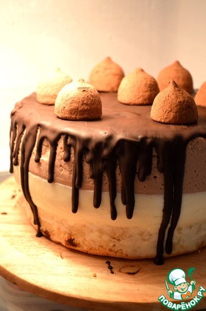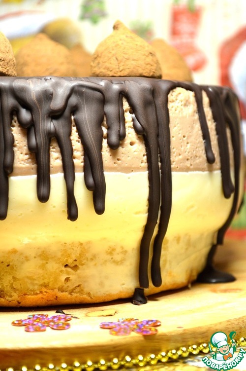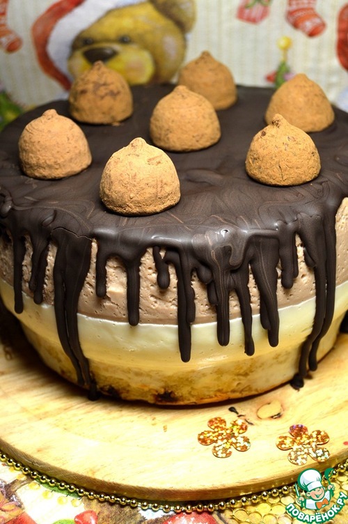 Глазурь растапливаем по инструкции на упаковке, аккуратно поливаем чуть теплой глазурью, застывает она на глазах. Поэтому сразу разверните трюфели и подготовьте, чтобы украсить ими торт, пока глазурь не застыла.