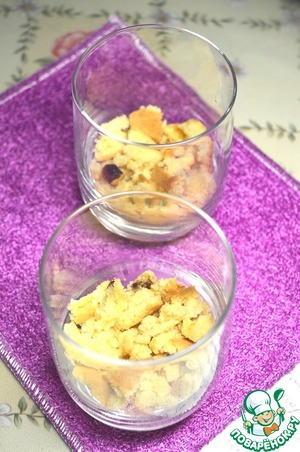 В форму для торта выкладываем на дно бисквит, оставшийся немного раскрошим и уложим в подходящие бокалы