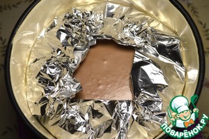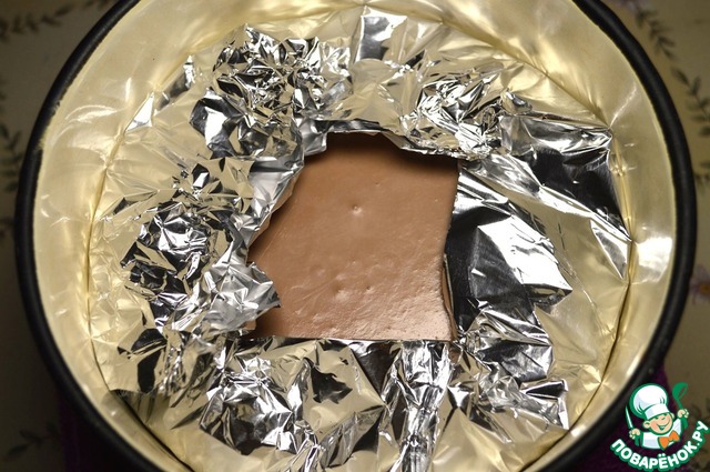 Готовый бисквит достаем, остужаем, вырезаем круг по нужной форме. Торт я готовила в кастрюльке с высокими бортами, по стенкам выстелила фольгой, чтобы проще было достать торт. В принципе, то же самое можно сделать и пергаментом для выпечки.