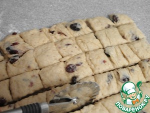 Выложить тесто на посыпанный мукой стол и раскатать его толщиной в 2-3 см. Нарезать на кубики 6х6 см, выложить на противень и поставить выпекаться в духовку при 180°C, примерно на 20 минут.