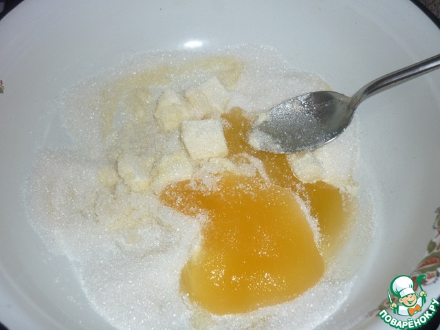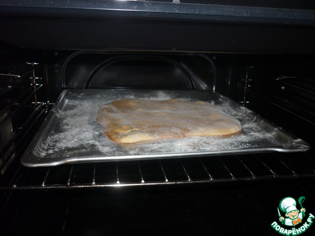 От теста отщипывать небольшие кусочки, как можно тоньше раскатывать и выпекать в духовке до золотистого цвета на противне, посыпанном мукою. Коржи обрезать по тарелочке, пока они горячие. -