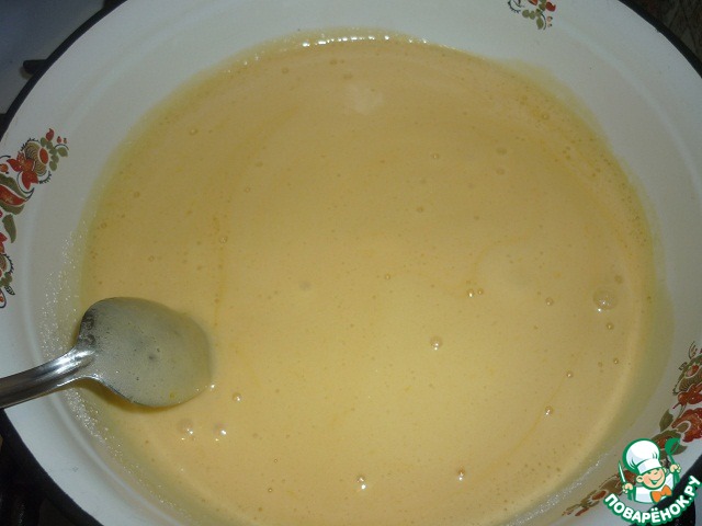 Как только смесь, стоящая на плите, начнет пузыриться (закипать), влить в нее тонкой струйкой яйца, перемешанные с содой. Масса мгновенно увеличивается в 2-3 раза от первоначального объема.