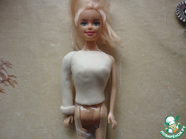 Обернуть нашу королеву пищевой пленкой и сделать ей верх платья из мастики. У меня белая покупная мастика, т к при приготовлении мастики в домашних условиях трудно добиться идеально белого цвета.