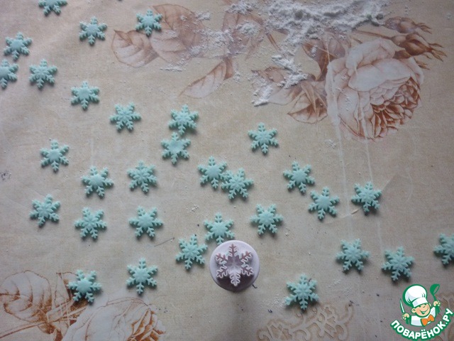 Раскатать и специальной вырубкой (купила еще летом, наконец-то пригодились) вырезать снежинки.
