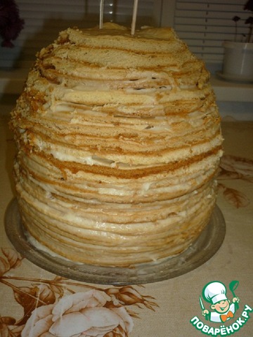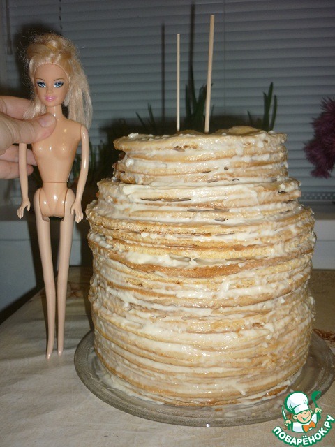 Из данного количества теста у меня получилось 20 коржей диаметром 22 см, 5 коржей по 18 см, 5 коржей по 15 см. Коржи переслоить кремом и убрать торт в холодильник на ночь - для пропитки. Торт получается высокий и на фото видно, что я воткнула две палочки для барбекю в торт для перестраховки, чтобы он не "поплыл".