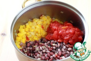 Всыпать фасоль и консервированные томаты. Перемешать и протушить под крышкой пару минут.