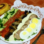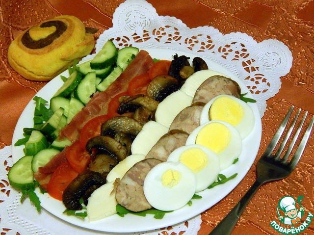 На большое блюдо выложить салатные листья и рядами уложить огурец, бекон, четвертинки яйца, СЫР (не забудьте про него))), помидор, грибы и ломтики куриного филе.