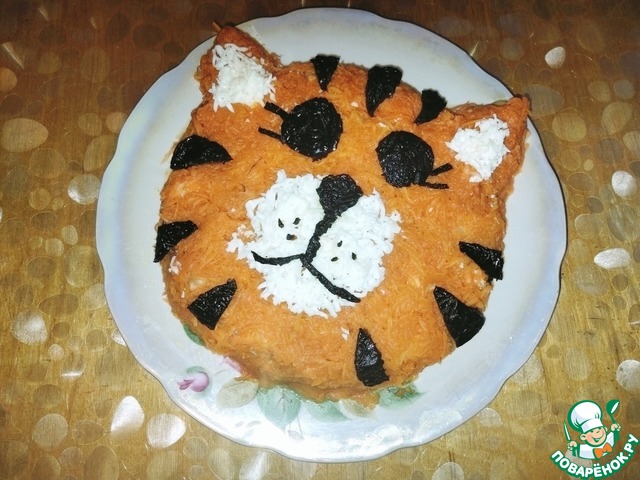 Смешать в чашке фасоль, корейскую морковь (на глазок, но побольше, я написала примерно 200 гр), окорочок, отжатый маринованный лук, майонез. Немного утрамбовать, перевернуть на блюдо, украсить по желанию.