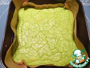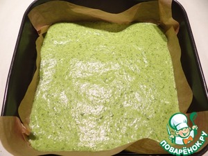 У меня маленькая духовка, поэтому для выпечки шпинатного теста я использую разъемную квадратную форму размером 23*23 см и выпекаю два коржа (если у Вас духовка большая, то можно использовать противень размером 28*40 см). Застилаю форму бумагой для выпечки, выливаю половину теста.