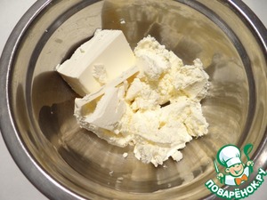 Пока коржи остывают, готовлю прослойку. В миске соединяю сливочный сыр и фету, с помощью вилки хорошо перемешиваю массу.