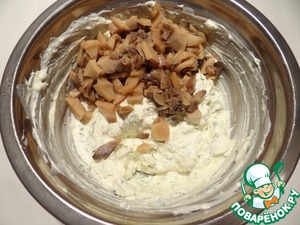 Затем добавляю растворенный желатин к оставшейся сырной массе, хорошо перемешиваю, добавляю шампиньоны.