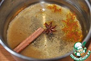 Берём сотейник, наливаем воду (400 мл), насыпаем коричневый сахар, добавляем шафран, корицу, бадьян.