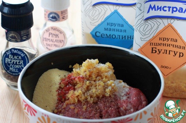 Говядину пропустите через мясорубку вместе с луком, добавьте промытый булгур, семолину (манку), паприку, соль, черный молотый перец. Влейте немного воды, примерно 2 ст. л., фарш должен быть немного вязким и мягким. Перемешайте и отбейте фарш об стол.