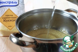 На гарнир можно отварить кускус или рис. Я приготовила кускус. Засыпьте его в небольшую кастрюльку и залейте кипятком в соотношении 1 часть кускуса - 2 части воды. Закройте кастрюлю крышкой и дайте постоять 10-15 минут.