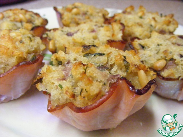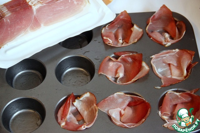 Формы для маффинов смазать слегка маслом, выложить в них "корзиночкой" тонко нарезанные пластинки сыровяленной шинки, высушенной на воздухе. Итальянский вариант предполагает бресалао - говяжья шинка. Я использовала шварвальденскую.