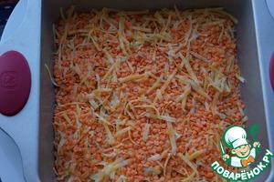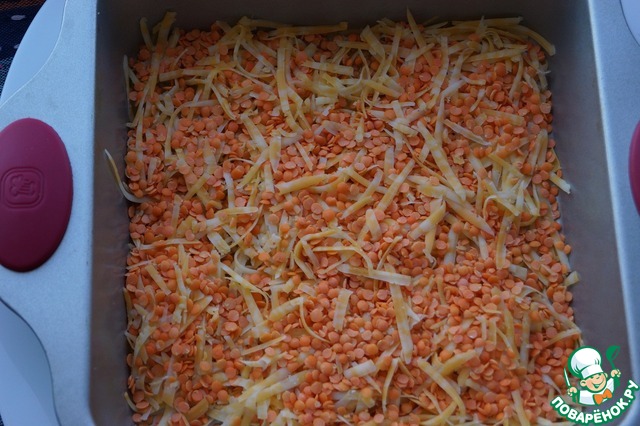 • Выложить красную чечевицу с сыром в форму, смазанную маслом.