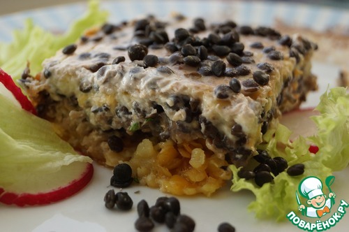 • Поверх мясного фарша выкладываем смесь черной чечевицы с сыром.