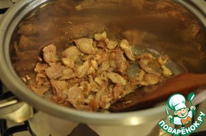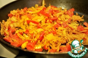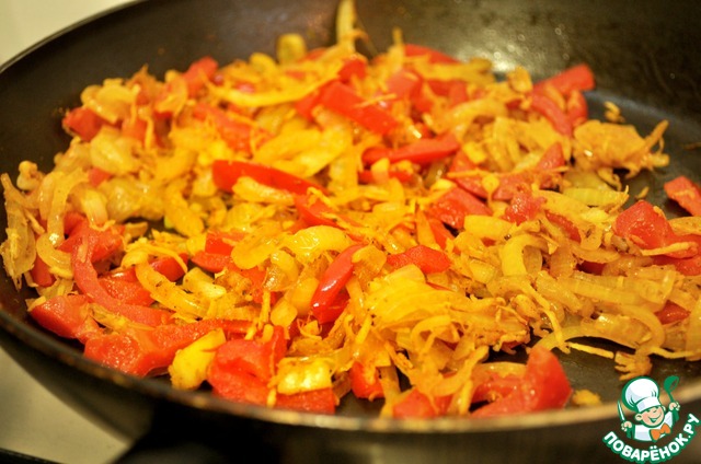 Сладкий перец, лук, чеснок, сельдерей нарезать и обжарить на оливковом масле.