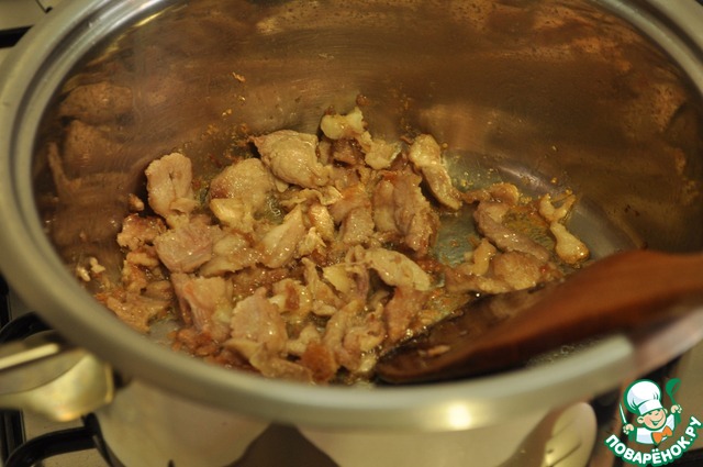 Такую фасоль можно смело готовить и без мясной составляющей, но для тех, кто желает, бекон (грудинку) нарезать и обжарить на сковороде или, если будете готовить фасоль в кастрюле с толстым дном, то прямо в ней. (У меня вместо бекона было мясо индюшки, но все же лучше бекон).