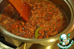 Добавить фасоль, лавровый лист, залить водой и варить до мягкости фасоли. На это может уйти около часа.