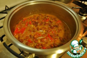 Овощи добавить в фасоль, посолить, приправить специями. Варить до готовности овощей, потом добавить вино. (Совет: если после добавления вина покажется, что блюдо кисловато (зависит от вина) — добавьте ложку сахара). Дать немного повариться вместе, чтобы все ароматы «подружились».