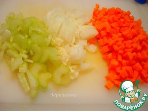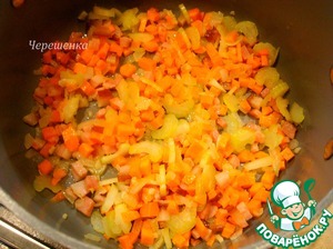 Добавить сельдерей и морковь, накрыть крышкой и пассеровать еще 5 минут.