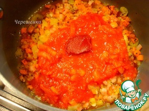Добавить пасту и отвар от фасоли, который мы сохранили. Довести до кипения и при закрытой крышке варить 5 минут.