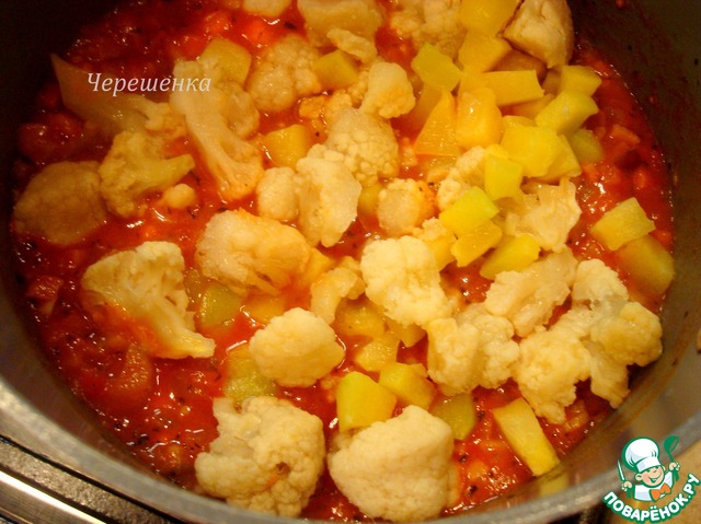 Цветную капусту разобрать на соцветия, а кабачок нарезать кубиками. Положить в кастрюлю, посолить, поперчить и тушить 5 минут.