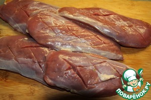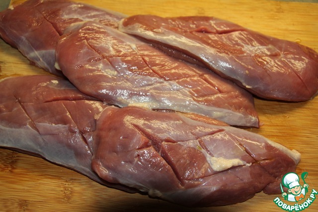 Уточку моем, обсушиваем, делаем надрезы крест-накрест.