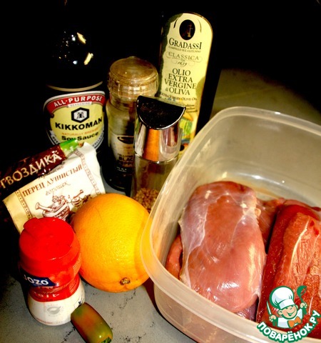 Приготовим маринад: измельчим острый перчик (у меня была половинка маленького перчика, но и этого хватило; не переусердствуйте), натрем имбирь на мелкой терке; в мисочке смешаем пряности; выжмем сок из апельсина (100 мл), добавим к нему оливковое масло и соевый соус; все перемешаем и добавим соль (если необходимо).