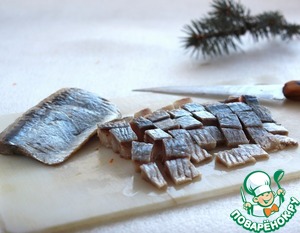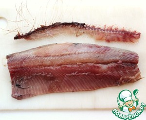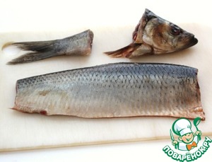 У сельди отрезаем хвост и голову, снимаем шкурку, убираем внутренности.