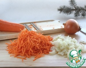Разогреваем столовую ложку растительного масла, обжариваем слегка лук, добавляем морковь, обжариваем 2-3 минуты до легкой мягкости. Остужаем.
