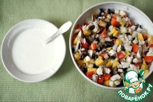 В отдельной мисочке приготовить заправку: смешать йогурт с солью, перцем чили, черный перцем, соком и цедрой лайма.