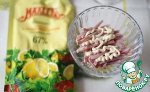 Выложить в креманки, смазать небольшим количеством майонеза.