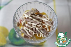 Приятный и легкий салат, который легко подстроить под вкусы гостей: для мужчин можно положить побольше мяса, а для дам - овощей. Отличный вариант для праздничного стола!