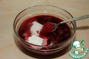 Готовим начинку. Когда вишня полностью разморозится, добавьте сахар и крахмал. -
