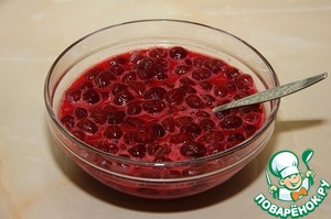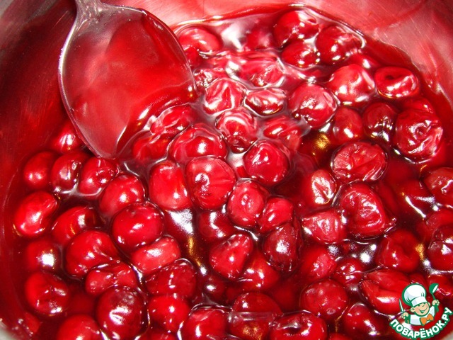 Затем перелейте в жаропрочную посуду и поставьте на огонь. Сначала сильный, чтобы побыстрей нагреть, а потом убавить на минимум. При этом вишню нужно все время помешивать. Не дайте ей закипеть, ее нужно подогревать. Вы увидите, когда начинка будет готова, она загустеет. Хорошо остудите ее. Начинка готова.