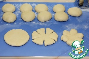 Но, если у вас ее нет. То соедините сначала все жидкие продукты, маргарин растопите и охладите, потом добавьте дрожжи и перемешайте. Затем всыпайте по чуть-чуть муку и перемешивайте лопаткой. Когда тесто нельзя будет таким образом перемешивать, то месите руками. Должна уйти вся мука, но вы все равно должны ориентироваться на свою муку, так как она бывает разная, а тесто нельзя забить ею. Оно должно быть мягким. Затем, переложите тесто в глубокую посуду, накройте пленкой или полотенцем и поставьте в теплое место на 30-40 мин, чтобы оно увеличилось в размере. Время тоже указано приблизительное, следите за тестом. Когда тесто подойдет, обомните его, разделите на две части. Одну разрежьте на 6 равных частей и скатайте из них шарики. Вторую, пока отложите в сторону и накройте пленкой. Каждый шарик раскатайте в лепешку, не тонко. Разрежьте на 6 секторов - лепестков не доходя до середины. Края каждого лепестка соедините друг с другом и подверните слегка вниз, чтобы спрятать защипы.