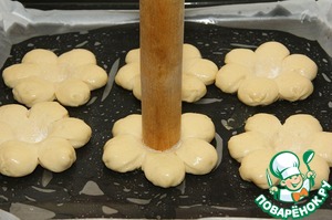 Переложите цветочки на противень застеленный пекарской бумагой и смазанный растительным маслом. У меня была бумага не лучшего качества, хорошую бумагу смазывать не нужно. Проделайте тоже самое со второй частью теста. Противень с булочками поставьте в теплое место, смажьте взбитым яйцом и оставьте для подъема на 15-20 мин. Затем, сделайте углубления в серединке цветочка концом скалки. Чтобы он не прилипал к тесту, макайте его в муку.