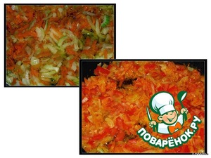 Обжарить лук, морковь. Добавить помидоры и пассеровать до испарения жидкости.