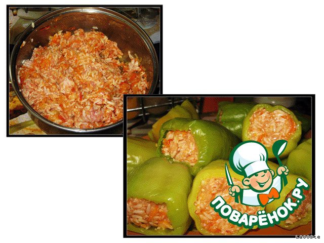 Сделать смесь для фарширования. Для этого необходимо перемешать мясной фарш, рис, пассерованные овощи, посолить, поперчить. Нафаршировать перцы