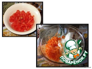Морковь натереть на терке, лук нарезать четвертинками колец, помидор кубиками.