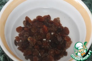 Промываем изюм, заливаем кипятком и замачиваем 10 минут.