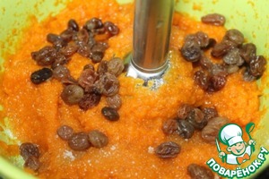 В готовое пюре добавляем половину изюма и 2 ст. л. сахара, взбиваем до измельчения изюма.