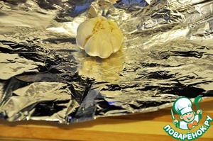 Тем временем берём чеснок, заворачиваем в фольгу и запекаем в духовке при 180 градусах 20 минут. Я это делала на решётке, положив почти на низ духовки и включив нижний нагрев.