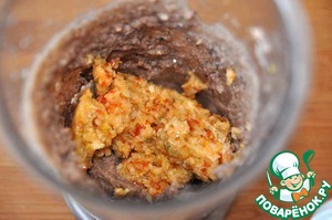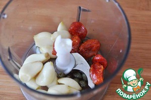 Очищенный чеснок, каперсы, вяленые томаты с маслом добавляем к фасолевому пюре и измельчаем всё блендером.