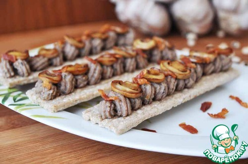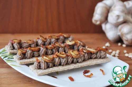 Далее можно просто выложить шампиньоны сверху фасолевой пасты, посыпать беконовыми "шкварками" и употреблять с хлебом.