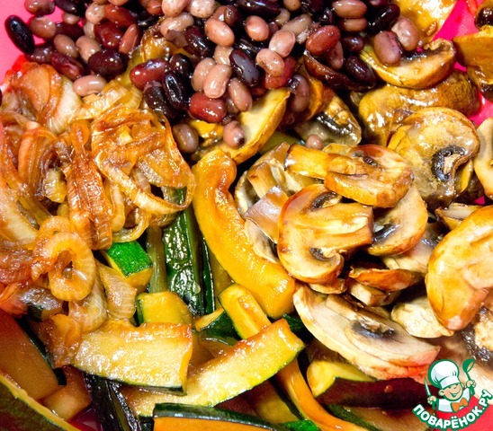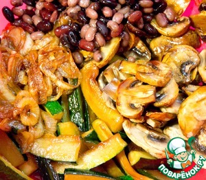 Затем соединяем нашу радугу вкусов: овощи, фасоль и перемешиваем. Данное блюдо больше не требует никаких заправок — оно уже очень сочное и вкусное. А благодаря фасоли - сытное.